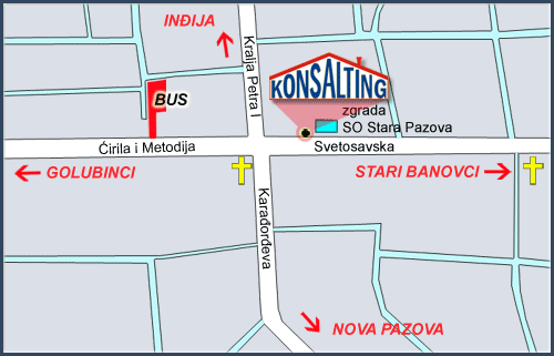 Sledeća mapa prikazuje uvećani detalj raskrsnice u centru Stare Pazove. "Konsalting" d.o.o. se nalazi u zgradi pored zgrade Skupštine opštine Stara Pazova.